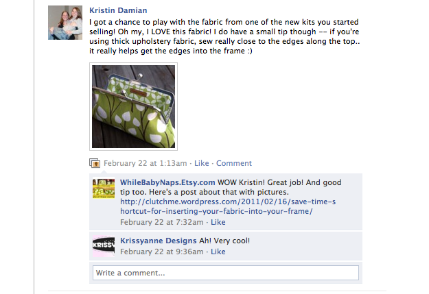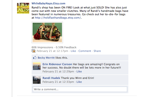 I have long advocated and tried to foster this camaraderie. Instead of seeing other clutch makers as your competition, I have shown you scientific proof that by banding together and taking advantage of consumer behavior of “taste uncertainty”, you will increase your chances of making a sale. It has been to my heart’s fulfillment that the Facebook fan page for WhileBabyNaps.Etsy.com has been filled with you leaving positive and congratulatory comments about each other’s work.