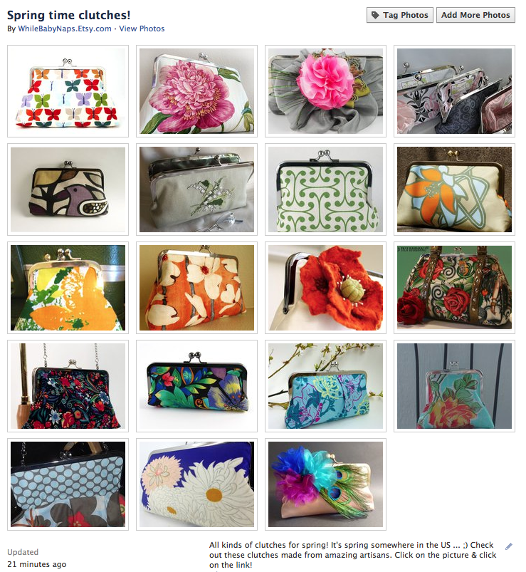 Just posted an album featuring clutches made by my sellers that has a spring feel and flavor. All made using my fine purse frames. Here’s a screen shot. Go check it out!