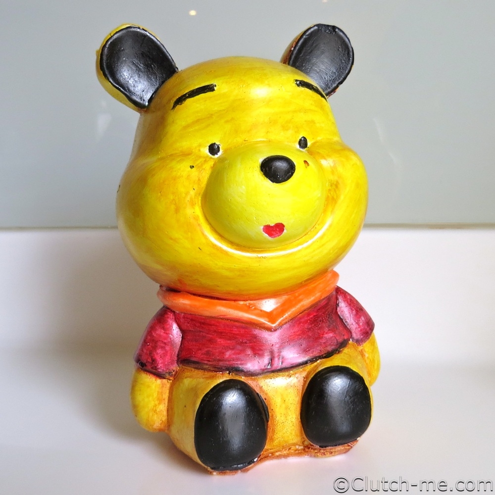 That “heart” was a chip in the figurine. I decided to highlight it by painting it red like a heart. Doesn’t it look like it’s either a tattoo on Winnie the Pooh, or like he’s puckered up like a geisha or Betty Boop?