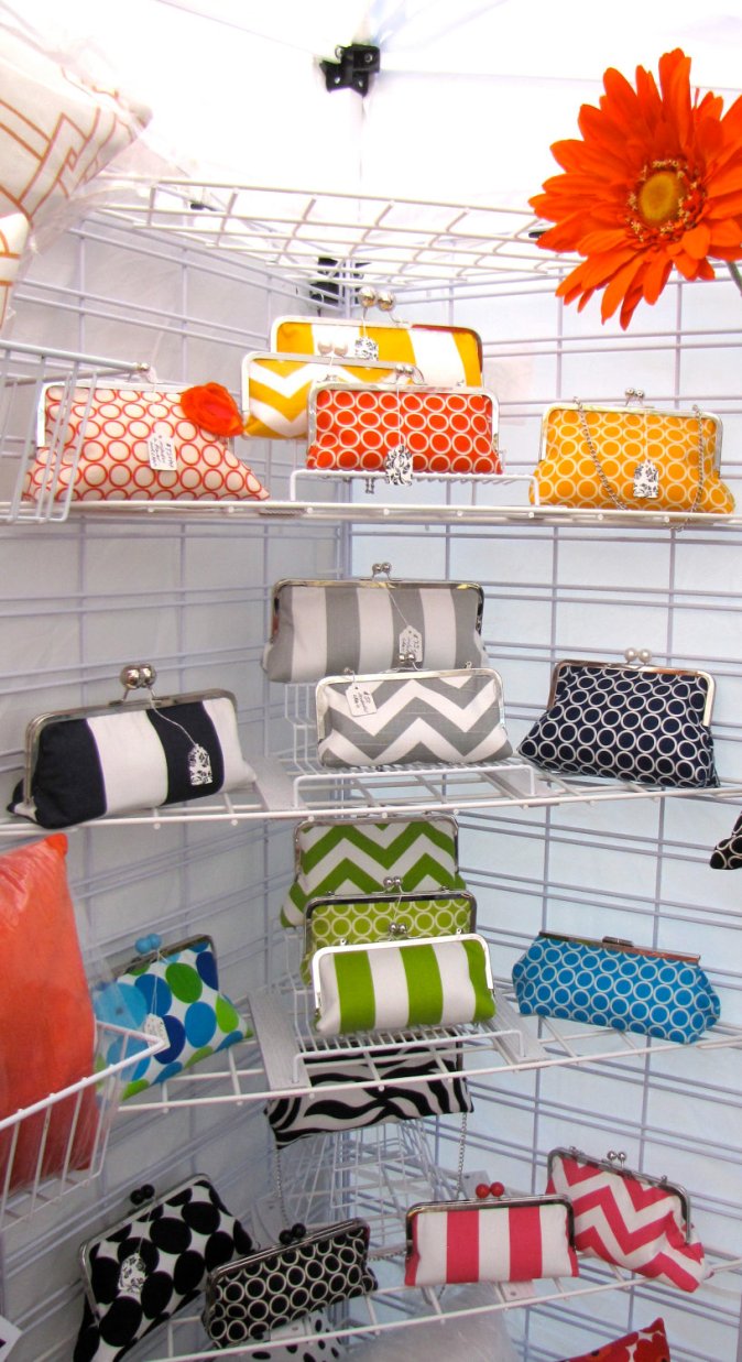 If you haven’t explored showing your clutches at Arts and Crafts Fairs, please check this post. Check your local and regional listings for Arts and Crafts Fairs now in order to save by pre-registering. Many have had great success showing their clutches at juried and non-juried shows. It’s great exposure and you can use the photos to market your items. One of my favorite recent photos of booths featured these beautiful bright and modern clutches. Linda at Mi Casa Bella had lots of interest and sales at her booth. I love the display and color layout here. Linda has such a singular vision in her creative aesthetics. If you have any photos of your clutches shown at a fair, market or boutique, send them to me and I would be happy to post them.