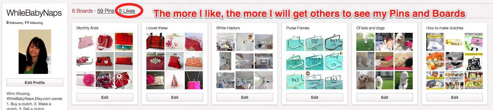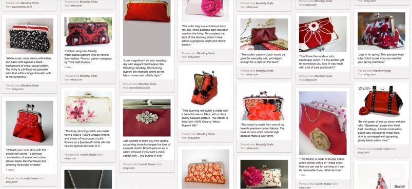 1. Pinterest is about pinning things you really love. So it’s not the same as say, Talbots or Ann Taylor putting their coupon codes and sales on their respective facebook fanpage or Twitter feeds. But you, as an Etsy shop owner, for example, can pin up clutches that you’ve made so others can see and (hopefully) like and repin. Then the people who see their pins might like and repin, and so on …. Don’t just pin about your clutches or shop. Remember to pin other things in your life that you really love! This is a fun place that you can mix your work and your personal favorites!