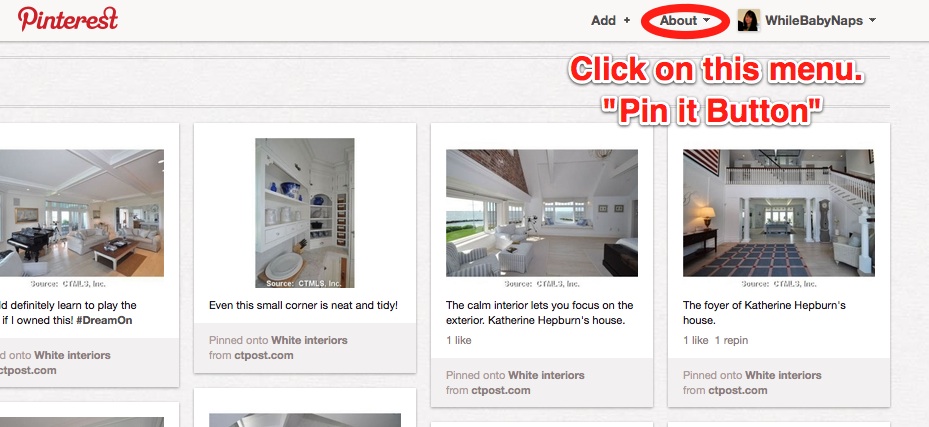 How to pin and how to create boards are easy. One thing that really helps is getting the “pin it button” by clicking on the About menu. When you come across something that you like, click on that on your toolbar and it automatically adds the link to the site.